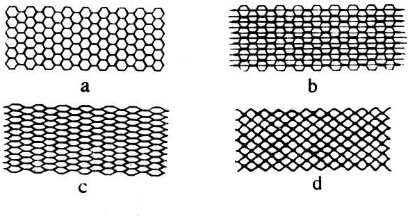 芯材是具有一定大小的蜂窝状孔格结构材料。通常将牛皮纸逐张用特制的涂胶设备单面滚涂胶料,相邻层纸上涂胶部位错开其距离为两胶条间距的一半,涂胶线宽度为正六角形一边的长度(图2)。纸张叠合胶粘成垛,继用铡刀切成一定宽度(即蜂窝芯子的厚度),然后加热使胶液凝固,将两端拉开,即成六角形蜂窝结构。如调整相邻层牛皮纸的胶粘位置和宽度,亦可得到其他结构形状(图3)。为了提高纸质蜂窝结构的强度和耐水、耐腐性能,可将纸经酚醛树脂处理,其用量为纸的15%,超过此量,经济效益就差。
