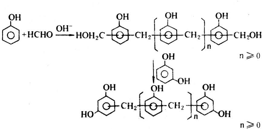 这是间苯二酚树脂中用得最多的一类,无论是苯酚、间苯二酚与甲醛共聚,还是分别制成苯酚—甲醛树脂和间苯二酚—甲醛树脂再混合,效果一样。苯酚对间苯二酚之比常为50/50,多的可达80/20。但是,随着间苯二酚用量的减少,树脂的性能也相应降低。根据要求,变化摩尔比、反应条件等,可得到多种性能的树脂。其反应示意如左下。