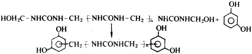 间苯二酚接到脲醛树脂的两端,反应式如下。此树脂性能稍次于苯酚—间苯二酚—甲醛树脂,耐水,能高频固化,可用于胶合板生产。这类树脂有较高的甲醛/尿素比,一般是先制成二羟甲基脲,再同间苯二酚反应,多数是酸催化,常用对甲苯磺酸,也可用氢氧化钠催化。