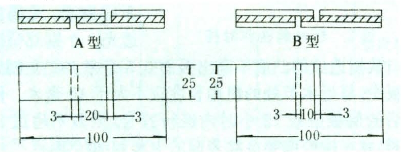 胶合强度是普通胶合板最重要的力学性能,是判别胶合质量的依据。中国测定普通胶合板胶合强度的试件形状及尺寸(见图),表板厚度自1毫米以下用B型试件。锯制试件时,试件的长度方向应与表板纹理方向一致。槽口深度应锯过芯板厚度到胶层上,槽口的配置要确保试件受载时,一半试件芯板的旋切裂隙受拉伸,而另一半试件芯板的旋切裂隙受压缩。为了检定胶层的耐水性,试件在测试前需经一定的湿状条件处理,根据耐水性的要求,规定了不同的处理方法。测试时,试件两端夹紧于试机的一对活动夹具中,以等速对试件施加拉伸载荷,试件破坏时的载荷除以两槽口之间的剪断面积即为该试件的胶合强度(B型试件还要乘以系数0.9)。对于厚芯结构的胶合板,在计算胶合强度时,还要乘以不同厚度比的胶合强度系数值。除用试件的胶合强度来评定胶合板的胶合质量外,还可用估测试件剪断面的木材破坏率作为评定胶合质量依据。