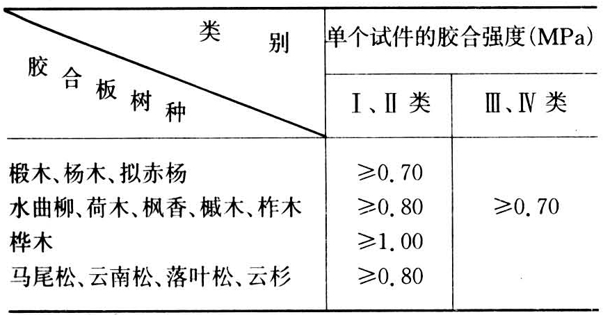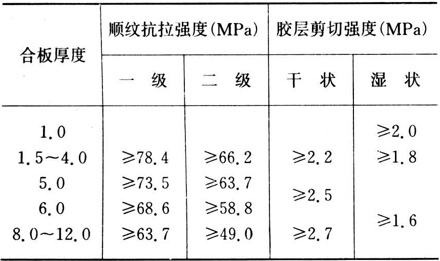 中国普通胶合板、航空用桦木胶合板以及木质层积塑料的力学性能指标值分别列于表1、表2及表3。有关各种特种胶合板力学性能的测试方法及指标值可从其有关产品标准中查阅。