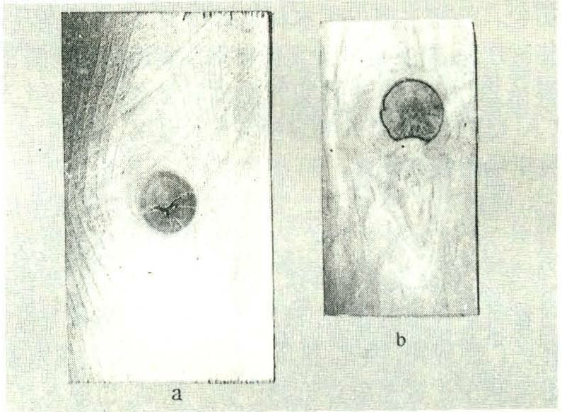 节子是木材中存在最普通的一种缺陷,能降低木材的材质和强度,其影响程度主要取决于节子的大小、密集程度以及在木构件上的位置。在一木构件上的节子,降低木构件的顺纹抗拉强度和冲击韧性比抗弯强度的降低要大,而降低顺纹抗压强度则较小。节子是木构件设计上规定构件的材质标准和确定各项强度的容许应力最重要的一项缺陷。节子降低木构件的承载能力(图2)。节子木质较硬重,影响材质的均匀性和表面质量,也不利于切削加工。多树脂的节子还会影响木材的油漆效果。