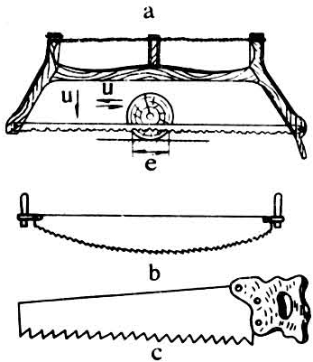 用于切割木材的多刃切削工具。锯的历史悠久,可上溯到旧石器时代。锯的制做由于时代、地理环境不同,用料亦异,有石、骨、蚌、铜、铁、钢、合金等。中国考古发掘出古代锯有山西下川石锯(图1a)、浙江河姆渡骨锯(图1b)、山东城子崖蚌锯(图1c)等。《天工开物》载:“凡锯,熟铁锻成薄片,……用鎈开齿,……齿钝之时,频加鎈锐。”进入14世纪初叶,世界上出现机械锯,1348年以风力或水力为动力的框锯在德国诞生,1777年荷兰发明圆锯,1808年英国发明带锯。中国机械锯的使用始于1898年。