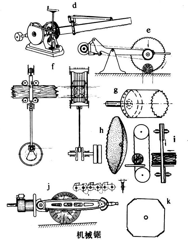 现代锯大致分为手工锯和机械锯(图2)两大类。按形状有长形锯、圆形锯、筒形锯、碟形锯、方形锯、带形锯、链形锯;按锯割方向有纵割锯、横割锯与自由曲线锯;按运动方向有往复锯、循环锯和旋转锯。