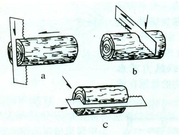 锯割时每锯齿为一基本切刀,被切掉的一部分木材是锯屑,同时形成锯槽(又称锯路),锯槽的两个侧面是被切的材面,暂时未被切开的面称锯槽底。锯割时,进给与切削方向对木材纤维方向的角度关系是复杂的。可分为:纵向锯割(图3a),进给方向平行于纤维方向,各锯齿似多把凿子排列起来;横向锯割(图3b)切削方向垂直于纤维方向,各锯齿似多把刀子排列起来;横向纵割(图3c)进给方向垂直于木材纤维方向,切削方向平行于木材纤维方向,各锯齿似多把刨子排列起来。