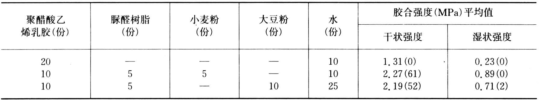 聚醋酸乙烯酯乳胶耐水、耐热、耐溶剂性能差。在空气湿度为65%时,吸水为胶重的1.3%,湿度为95%时,吸水为胶重的3.5%。软化点为45~90℃,固化后的胶层易蠕变,使胶合强度下降。这些缺点可用重金属盐如氯化铝、氯化锌作交联剂,通过与热固性树脂混合或使醋酸乙烯单体与另外一些单体如丙烯酸酯单体共聚的方法,来提高其耐水性和耐热性(如下表)。