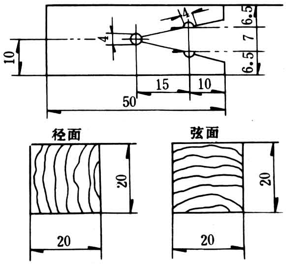 木材抵抗劈开的能力。抗劈力的大小反映木材沿纹理方向劈开的难易和木材钉钉的效果等,对选择适当的箱板、工具柄、建筑构件的连接、地板、家具、纺织木梭、车辆等用材时,木材的抗劈力具有一定的参考意义。使木材劈开的力如同楔子的作用,抗劈力集中于木材裂口的底部,在破坏面上的应力分布是不均匀的。中国国家标准GB 1942—82《木材抗劈力试验方法》,规定了试验抗劈力试样的尺寸和形状如下图,试件分木材的径、弦面,放在试机的抗劈试验附样上,以一定的速度施加拉伸荷载直至试样破坏为止。抗劈力按下式计算: