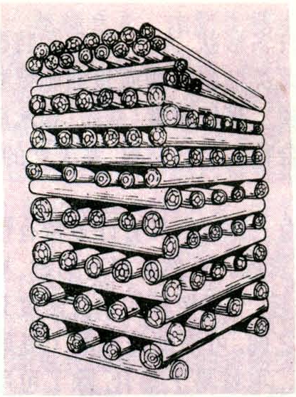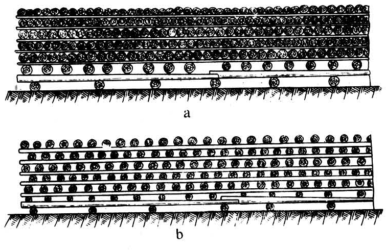 在较短期限内通过剥皮和堆成通风楞,使原木边材含水量迅速降低到25~20%以下。原木剥皮时,两端应留10~15厘米宽剥去粗皮的树皮圈以抑制端头开裂。材身剥净外皮,尽量保留内皮,以防止青斑和减轻开裂。干存楞垛均需设置高30~50厘米的楞基或楞脚,以利于楞垛内的空气流通。楞中每层原木之间用径级较小的健全原木作垫木。底层原木(楞脚上第一层原木)彼此相距10~30厘米,底层以上每层中的原木紧密相接或疏松保持3~5厘米的空隙(图1)。短原木亦可堆成方格楞(图2)保存。在多雨和炎热地区,对容易腐朽和开裂的原木楞垛必须加设防雨、遮荫篷盖,以防止雨水落入裂隙,助长真菌危害和阳光直接照射加剧原木开裂。