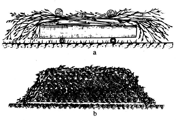 要求边材保持采伐时的高含水率,使菌、虫难以发育、繁殖,亦不易产生开裂。本法包括简易湿存和人工降雨两种方法。①简易湿存:适用于林区新伐原木短时期的保管,地点应选择林荫和低湿采伐现场。树木伐倒后,不剥皮,迅速密堆或单根存放,并立即采取严密遮荫措施(图3)。特别是端头截面,遮荫层至少40厘米厚,以保持新伐材的高含水率。楞脚用小径木,层间不放置垫木。对耐腐性弱或容易开裂的树种,端头还应立即涂以防腐、护湿涂料。②人工降雨湿存:系将原木归成密实大垛,采用喷水方法以保持高含水率。楞垛堆好以后,即应开始喷水。第一次喷水的时间要长,使楞垛的最底层也被水浸湿。以后根据一昼夜喷水量规定出喷水次数。每次喷水约10~15分钟,每立方米木材喷水约10~15升。喷水次数,每昼夜少则3~4次,多则8~10次,因树种、材种、气候、季节等因素而定。喷水通常在白天进行,但连续下雨时可不必喷水。