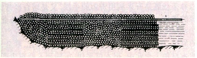 将原木沉没水中,使原木长期处于高含水量的状态下,免遭受菌、虫和开裂的损害。此法系在流速缓慢的河湾、湖岔或贮水池中采用楞垛沉没法(图4)或多层木排沉没等法保存。但对露出水面的部分,要经常进行喷水。
