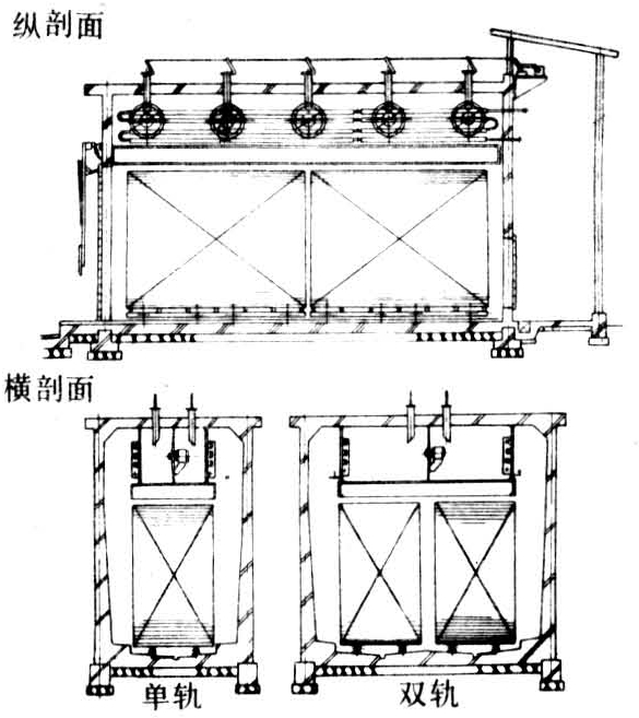 窑内由“假天棚”分成上、下两部分,上部为风机间,下部为干燥间(见图)。多台轴流风机同装在一根长轴上置于风机间内,用一台电机带动。加热器布置在风机间或干燥间的两侧。这种窑因管理廊在端头,可多间干燥窑联成一片,占地少并便于统一管理,适用于干燥规模较大的工厂。