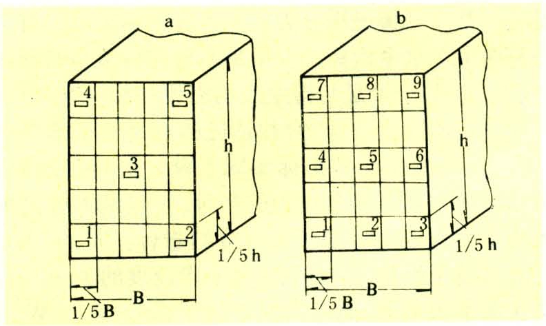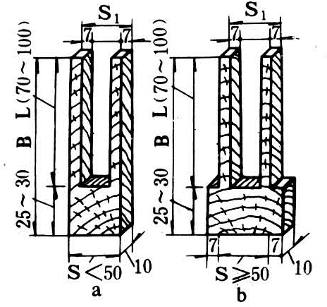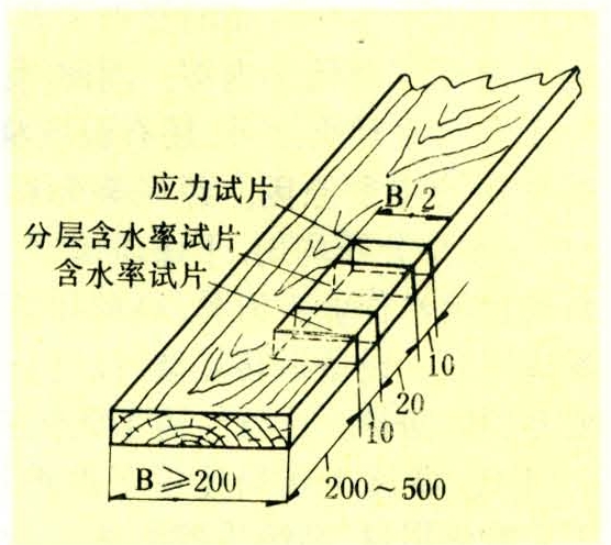 直接测定干燥应力б较复杂,对于质量检验,只分析梳齿形试片的梳齿变形率。即如图4所示将应力试片锯成梳齿状。a图用于S<50毫米,b图用于S≥50毫米。若锯材宽度B≥200毫米时,应力试片可按锯材宽度的一半(B/2)锯解,如图5,梳齿齿根取在板材宽度的边部,齿尖取在中部。