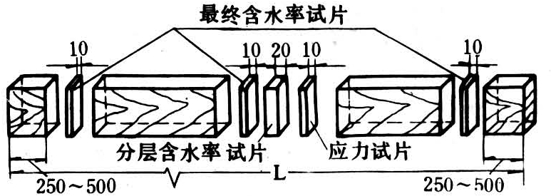 图2 由检验板锯取三种试片L为含水率试验板长度