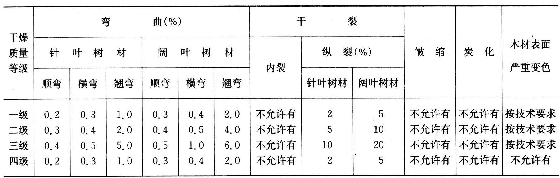 根据要求的干燥质量等级,窑干合格率应不低于95%(或降等率不高于5%)。