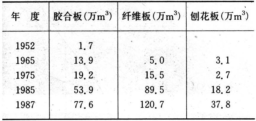 胶合板生产技术也是20世纪初由英、日、俄等国商人在上海、天津、哈尔滨、长春等办厂的方式传入中国。到1949年,年产量不足2万立方米。1949年后得到迅速发展,1987年全国有180多个胶合板厂(车间),实际产量77.60万立方米。纤维板、刨花板是1958年开始,通过中国科技人员研制与引进国外技术相结合迅速发展起来的(详见表2)。