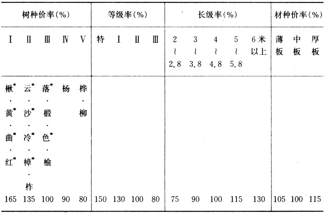④加强木材产品价格和流通管理。调整木材价格及不同树种、不同材种、不同产品的价格比率,能够促使企业合理利用木材资源,并限制、调节和引导某些木材产品的生产及消费,提高木材工业的经济效益。中国对原木、锯材和胶合板长期实行按计划价格进行统购统销,纤维板和刨花板则没有纳入全国调拨计划,价格可随市场供需状况起伏。木材计划价格已经几次调整。在1985年南方集体林区开放木材市场,所产木材退出统购统销,实行议价议销之后,对东北、内蒙古国营林区木材计划价格进行第四次调整,提高幅度44%。为抑制锯材加工能力的盲目增长,锯材计划价格只提高8%。并扩大了原木和锯材的树种差价率、等级差价率、长级差价率及材种差价率(详见表3)。经过这次价格调整,红松由二类树种升为一类,水曲柳由三类树种升为一类。椴木原木进锯制材要损失价值40%,促使其全部调给胶合板厂使用。特级原木和8米长的原木进锯制材要损失价值15~75%,应供给有特殊需要的用户。用一般原木加工出特级锯材,可提高销售价格50%。这样有利于木材资源的合理加工和合理流通,作到优材优用、优材优价。