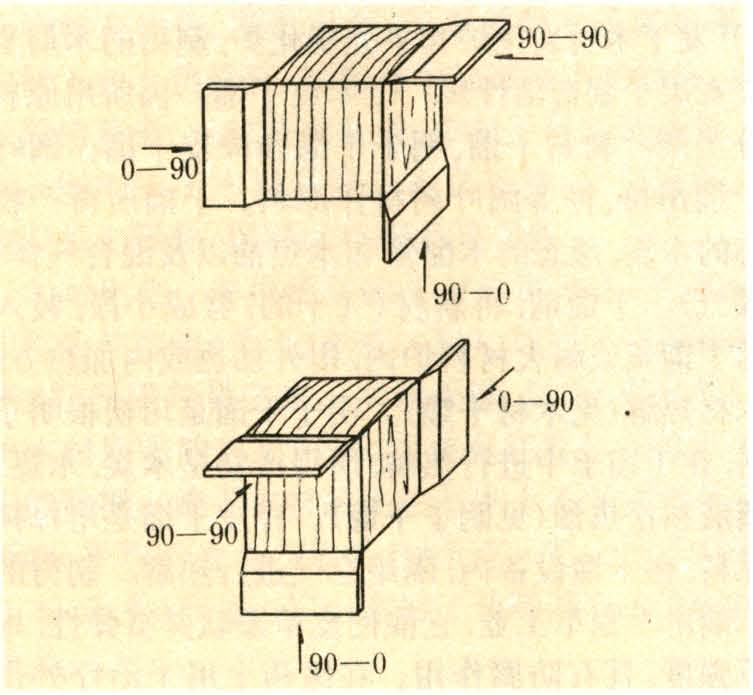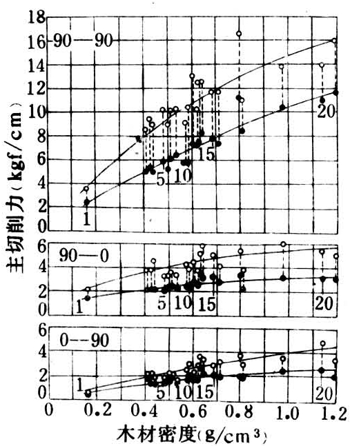 木材的切削性质受多种因素影响。木材的密度、含水率、解剖构造和化学成分对切削性质都有影响。木材的密度越大,切削阻力越大,刀具磨损越快。根据木材的密度可对切削阻力做粗略的估计。芬兰基维玛(E.Kivimaa)关于21种木材在三个主要方向的直角自由切削中,主切削力与木材密度关系的试验结果如图1所示,三个主要切削方向代号为90—0、0—90和90—90(图2)。木材有扭转纹、交错纹或应拉木不易加工出光洁的表面。木材中的硬矿物质在切削中会显著地加剧刀具磨损,木材的pH值在含水率较高时对刀具磨损也有显著的影响。(管宁)