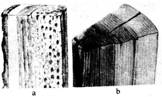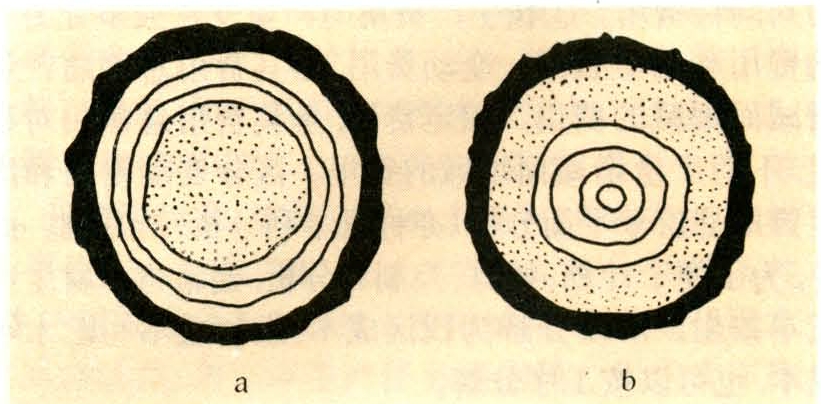 木材在适宜的环境条件下,主要受木腐菌、细菌的侵害,使细胞壁受到破坏,木材色泽和结构改变,最后变得松软易碎,呈筛孔状、粉末状或海绵状等形态。从衰老的立木到伐倒木、原条、原木、锯材、木制品以及各种建筑结构材等都会遭受木腐菌的侵害形成腐朽。木腐菌感染途径及其造成的缺陷是:①在活立木上,孢子和菌丝常以根部、干部或梢部的伤口或断枝处侵入,形成根腐、干腐或梢腐。由于边材系活细胞,有生命力,故有抵抗菌类侵害的能力,因此,木腐菌只侵入心材,造成心材腐朽,或称内部腐朽(图1a),周围材质完好的空心称铁眼。②在贮运中的伐倒木或原条、原木上,边材逐渐失去活力,水分不断减少,致使边材丧失抵抗菌害的能力,使木腐菌得以侵入而形成边材腐朽(图1b)。③使用期间的木材和木制品,也能受到木腐菌侵害。特别是与水或土壤接触和受潮的木材,容易受到感染。有的木材在制成各种结构材和木制品之前,已经受到菌类感染,潜伏在木材中的菌丝或孢子一旦条件合适,就能复苏继续繁殖,形成腐朽。木材腐朽可分为初期、中期和后期等阶段。①初期腐朽:木材颜色发暗或变浅,用显微镜观察,细胞腔内有少量的菌丝。②中期腐朽:木材颜色变浅或加深。细胞腔内积聚着大量菌丝,细胞壁被菌丝分泌的酶溶蚀,逐步变薄,有的还穿蚀成许多不规则的孔洞,致使细胞壁遭受破坏,木材基本性质发生显著改变。③后期腐朽:木材即成朽木,呈纤维状、层状、块状或绵软状,发生皱痕、龟裂或多孔而成碎片。根据腐朽材的形态和色泽,可将腐朽分为白腐、褐腐和软腐等3种类型。