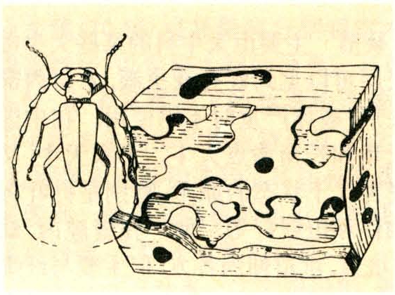 主要由天牛科的某些天牛侵害所形成。木材表层可以见到蛀孔或虫眼,木材内部则充满粉柱状的蛀屑,破坏严重时不堪使用。在中国危害木材的有家天牛和长角凿点天牛。①家天牛:又名腐木天牛。常侵害气干状态的原木,特别是针叶树材制成的建筑物构件和电线杆等。卵产在缝隙内,幼虫咬蛀成不规则的坑道,坑道伸向各方,但主要与纤维并行。幼虫的虫眼较大,直径6~8毫米。深入边材内部,断面呈椭圆形,坑道均充满细的蛀屑。幼虫完成其发育后,即转向表层在其稍下方筑蛹室,用细的蛀屑堵住蛹室化蛹。经羽化后的成虫,即从咬蛀成直径为0.5~1.0厘米的卵形孔中飞出。确定木材的受害程度时,要用小锤敲打,凭借声音来判断。同时,敲打受害木时,会有白色微细的粉末蛀屑从缝隙内震出。②长角凿点天牛:又称长角栎天牛。分布在中国山东、广东、台湾等地。主要危害房屋建筑和家具木材。被害树种很多,多是阔叶树材的边材。成虫卵产在细小的缝隙或小虫孔中,深约5~7毫米。幼虫孵出后,即蛀入木材以淀粉和可溶性糖类为食,外面无任何痕迹。幼虫坑道极不规则,坑道内充满粉状蛀屑。坑道深度可达20~24毫米,直径7~10毫米。老熟幼虫在坑道末端筑室化蛹,新成虫常穿凿椭圆形羽化孔钻出。