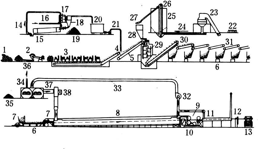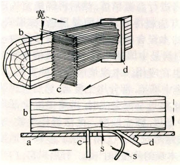 制造木丝是用刨木丝机。刨切方式有平刨式(图1)与梳刨式。所产木丝大量用作包装衬填。木丝板制造用的木丝规格为:粗木丝,长100~300毫米,宽5毫米,厚0.3~0.5毫米;细木丝,长度、厚度与粗木丝同,宽度为1.5毫米。中国木丝板所用木丝规格为:长200~300毫米,宽3~6毫米,厚0.2~0.5毫米。木丝板生产工艺多种多样,而以上述工艺为基础所形成的生产流水线具有代表性者为奥地利的海拉克里特法,其流程见图2。该法以菱苦土(MgCO3)为原料,经过煅烧,一部分失去CO2,成为MgO,作为粘合剂。木丝刨出之后由条板运输带输送到与菱苦土搅和的搅拌机中,而在条板运输带上方则喷以硫酸镁溶液,多余的溶液则滤去。当菱苦土与木丝中预先喷洒在木丝上的硫酸镁接触后,很快就会凝固。成型带上方分很多料斗下料,铺成的板坯在一个长30米的压力运输带中一边加压,一边在炉道中行进。炉气温度达400℃,经过10分钟,菱苦土即固化。由于各地的菱苦土成分不尽一致,且木材的化学成分对木丝与菱苦土的粘合力也有很大影响,所以这种板材的性能很难达到一致。