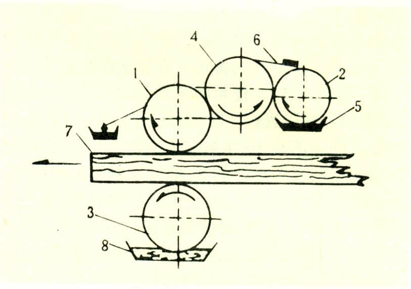 将专用的装饰纸浸渍合成树脂,干燥后热压贴在基材上,形成具有一定硬度、光泽、耐磨性等的膜。常用的树脂有低压三聚氰胺、邻苯二甲酸二丙烯酸酯树脂、酚醛树脂等。装饰纸的树脂含量一般为100~150%,底层纸的树脂含量约40%。根据用途不同,纸张分装饰纸、表层纸、底层纸等。装饰纸的定量为80~150克/平方米。为防止贴面后板材产生翘曲弯形,需在相对一面加贴平衡纸。