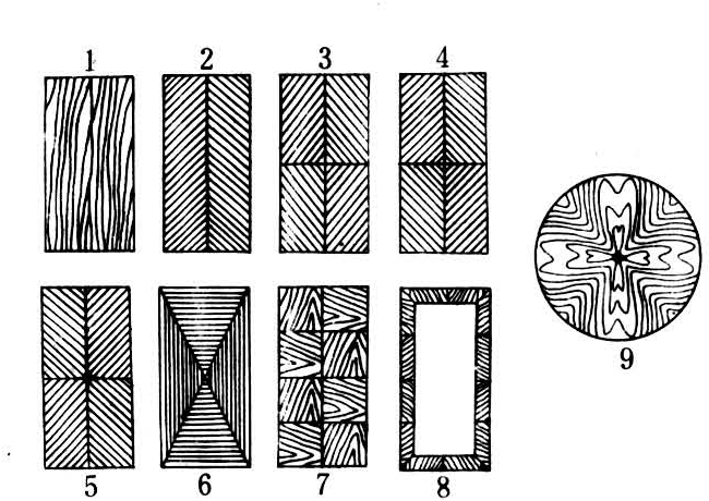 采用刨切、旋切等方法将木材加工成0.2~1.2毫米的大幅面薄木,呈现各种纹理和色彩。常用水曲柳、柚木、桃花心木、花榈木等珍贵木材加工薄木。还可根据设计和审美要求将薄木拼贴成美丽的图案(图5)。生产中还大量使用人造组合薄木和集成薄木进行贴面。人造组合薄木是将纹理不明显的单板染色,然后按一定规则组成板坯,加压胶合成木方,再刨切成薄木。集成薄木是将一定规格和材色的木方按设计要求胶拼成各种图案的集成木方,然后刨切成薄木。在胶贴前,需将薄木干燥到含水率8~12%。但厚度约为0.2~0.3毫米的薄木可以不经干燥进行湿贴。贴面用胶粘剂一般为脲醛胶与聚醋酸乙烯酯乳胶的混合物,为防止透胶,通常在胶料中加入10~30%的工业用面粉。薄木可采用冷压或热压法贴面。贴面前基材必须砂光到要求的粗糙度。贴面后薄木表面还需进行透明涂饰。