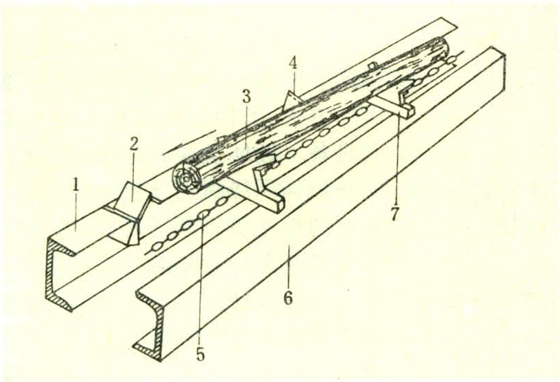 是抛木承载梁整体绕牵引构件翻转而实现原木自抛。在这种抛木机中(图2),承载梁沿槽钢轨道运行。正对楞位的抛木一侧的轨面开设若干个小门,其间距恰等于两承载梁间距,小门数与承载梁间距和原木长度有关。当应抛原木走近自己的楞位时,各小门板脱钩并在配重作用下开启。当承载梁一端掉入门穴时,承载梁失稳,先呈倾斜,继而绕牵引构件翻转,原木被抛下。承载梁在翻转过程中推压小门板而关闭并自锁。倾翻的承载梁在适当地点复位。只要在两轨道上均开设小门,即可实现双面抛木。理论和实践证明,原木自抛性能很好。不论原木直径大小、原木弯直和装载偏斜与否,都能可靠地被抛卸下去,抛木时间只需0.3~0.5秒。