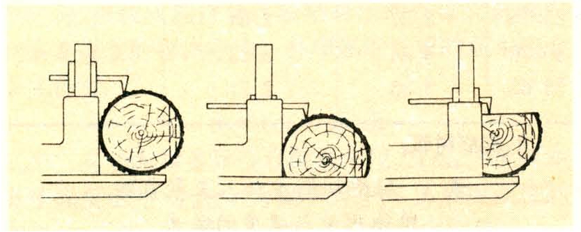 即在原木一侧锯去一块板皮,或继续锯割一两块毛边板。再将原木向车桩相对面翻转90°,把锯割面扣在车盘上,锯去相邻一侧板皮,继而平行这个锯割面依次锯割或下连料。当锯割到一定程度时,再根据原木条件和习惯向车桩的相对面翻转90°,或向车桩方向翻转180°,锯去板皮,继而依次锯割。下锯顺序如图。