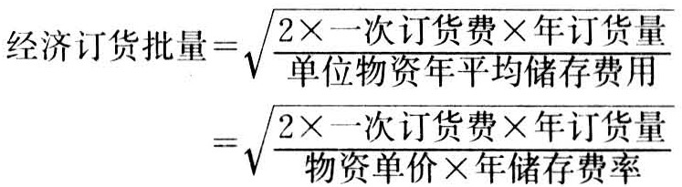 主要是通过确定合理订货批量,以最低的物资存储费用来计算物资储备定额。确定经济批量,需要同时考虑订货费用和储存费用。订货采购次数多,订货批量就小,两者成反比,订货费用同订货次数成正比,储存费用同订货批量成正比。经济订货批量是使订货总费用和储存总费用之和最小时的一次订货量,可用下列公式计算: