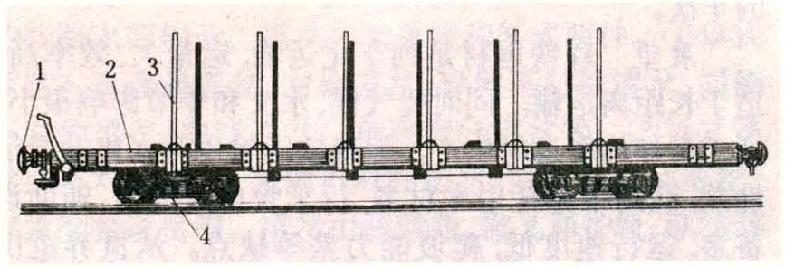 专用于森林窄轨铁路上的木材运载设备。简称森铁运材车辆。分台车和平板车两类。①台车:主要用于运输原条(一种长木材),通常是两个台车组成一辆,运材时中间靠所装的木材联结,空车时中间用联结装置联结。根据载重大小和结构形式分7吨普式、7吨德式、14吨合并式和20吨台车4种,前三种已淘汰。20吨台车(图1)车架上面装有用槽钢和钢板制成的转向梁,转向梁两端设有车立柱,通过操纵一侧的杆件可以使另一侧的车立柱打开,以便卸车。转向梁上面设有卡齿,防止原条前后串动。转向梁下部中心与车架铰接,下部两侧设有旁承。这样,当通过曲线时以铰接处为中心使转向梁与车架作相对转动。两台车之间有联结装置。车架长3米,宽1.31米,自重5.2吨。②平板车:主要用于原木运输。车体上面为平板形,两侧设若干对钢制车立柱,两端设联结装置(图2)。载重15吨,车架长10米,宽1.8米,自重7.6吨。