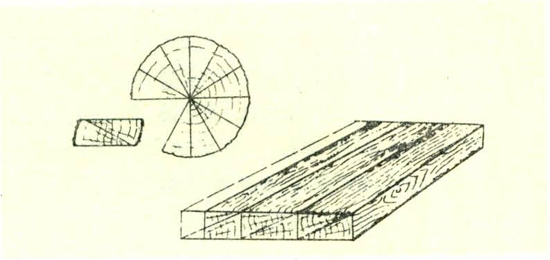 锯口沿径向将原木锯成四开材,再割成一定弧长扇形材的下锯法(见图)。将两块扇形材厚薄相对,径向面相向胶合成板材;侧面采用平面、斜面、楔形或榫形两两胶拼,可成为需要宽度的板材;端头采用指形榫胶接,可成为需要长度的板材。最终可成为使用价值较高的板材。