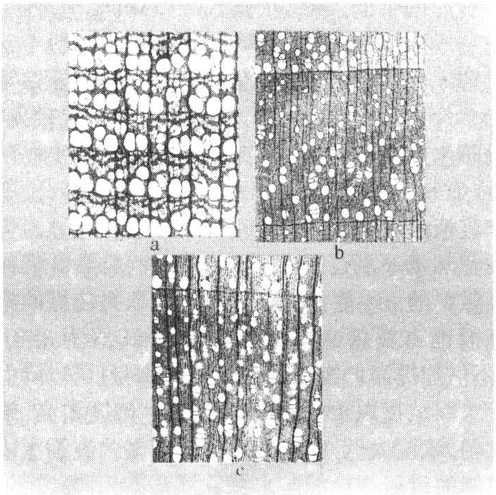 阔叶树材中常根据生长轮内管孔在横切面上的大小和分布等情况的不同,分为环孔材、半环孔材和散孔材三大类(见图),它常可作为阔叶树材识别的第一个主要特征。