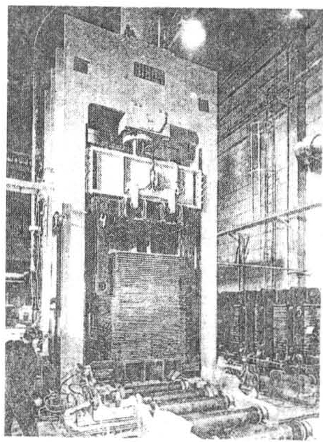 联邦德国比森公司于1983年制成的石膏刨花板成套生产设备,该生产线曾经在该公司自建的中间规模生产车间中进行生产。刨花厚0.25~0.30毫米,拌石膏之前刨花含水率约为140~150%,刨花作为水的载体,与石膏相遇后,石膏即与水分起作用。为了加速或延缓石膏遇水后的凝固速度,可加入某些盐类。压机压力一般为1.5~2.0兆帕,不加热。压制终点以板坯中石膏释放的水化热而导致板坯的温度上升情况加以确定。一般情况是石膏结晶过程放热使板坯温度上升20℃左右。固化时间约6分钟,压出的刨花板含水率约为20%,再经干燥。干燥机内循环空气温度为40℃,干燥后刨花板最终含水率为2~3%。芬兰的工业规模石膏刨花板厂的生产原理基本与上述者相同,但所用的主要设备却有不同。该厂铺装是用气流成型机,加压则采用堆积式压机(见图)。木材与石膏的重量б为0.20~0.30,水与石膏重量б0.25~0.35。压机压力为1.2~2.0兆帕。压后的板坯含水率为15%,干燥后含水率达到2%左右。