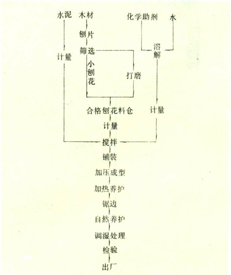 水泥刨花板生产工艺与平压法树脂胶刨花板相似,最大不同点在于水泥刨花板是以水泥为胶粘剂。可以用早强水泥或500号硅酸盐水泥。因木材中糖成分对水泥有阻凝的作用,在使用500号硅酸盐水泥时需要加入诸如氯化钙、硫酸铝、氢氧化钙、水玻璃或三乙醇胺等化学促凝剂。压制水泥刨花板时可采用冷压工艺,但必须有养护过程,其流程如图。