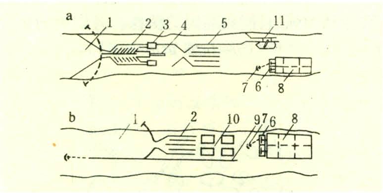 将单漂流送下来的木材拦阻到收漂(拦木)工程内,然后在水上进行分类、编排和合排的场所(见图)。由收漂段、原木分类段、编排(装排)段和合排段组成。工艺流程依排型而异:①编、合木捆排。首先将单漂流送下来的木材拦阻收贮于收漂工程,然后根据需要将收贮的木材经拆垛送进分类设施,按不同的树、材种规格进行检尺分类,最后将分类后的木材按照编、合排的需要,顺序引进编排通廊,由编排机编扎排捆后再引入分类合排设施,合成轮拖木排。②编、合平型排。将分类后的木材编扎成平型排排节的底排,下放至装排作业段再由装排机向底排上面装载木材,编装而成的平型排节由拖轮拖至合排段,合成轮拖木排。如果编、合排水上作业场需装船进一步运输时,还要在水上设置装船作业段。