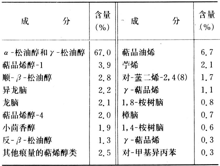 主要含氧化合物有α-松油醇、β-松油醇、γ-松油醇、α-小茴香醇、龙脑、异龙脑、樟脑、萜品烯醇-1、萜品烯醇-4、二氧松油醇、甲基佳味酚、茴香脑、1,4-桉树脑、1,8-桉树脑等。主要萜烯成分有萜品油烯、苧烯、α-萜品烯、γ-萜品烯、对-二烯-2,4(8)、对-甲基异丙苯、α-蒎烯以及倍半萜烯。在合成松油中含有较多的萜品油烯,不含有茴香脑和甲基佳味酚,存在痕量樟脑。水蒸气蒸馏松油含有较高的龙脑和茴香脑。合成松油的主要成分含量见下表。