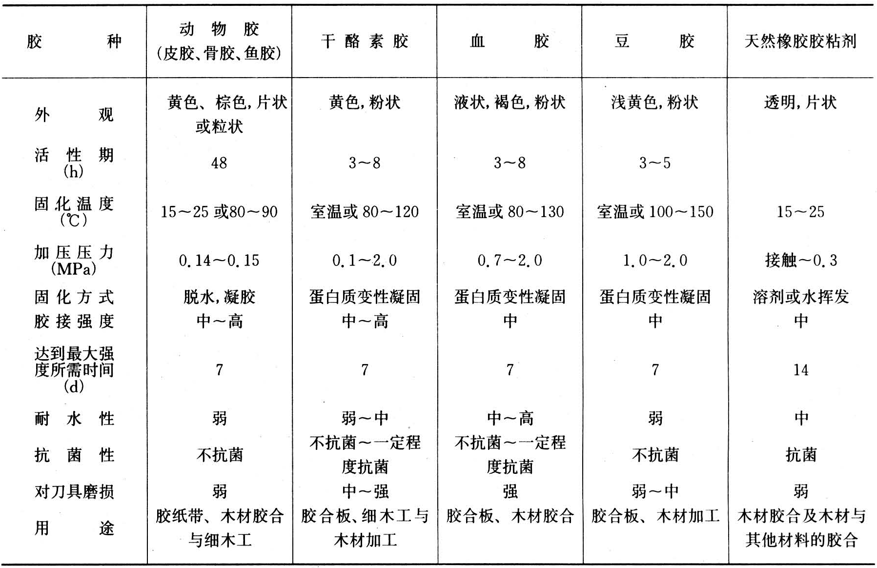 木材工业中常用的天然胶粘剂有血胶、豆胶、干酪素胶、骨胶等。其中骨胶、皮胶的水溶液可直接使用,血胶、干酪素及豆胶等均需加入一些化学药品,经调制后才能使用。血胶可以在温室下固化,也可加热固化,胶接强度较高,特别是耐水性比其他天然胶粘剂好。血胶主要用作生产胶合板和木材的粘接。但血胶的色泽很深,容易污染被胶接物,有臭味并易受菌类腐蚀。豆胶是将大豆蛋白与水调制成一定浓度的溶液,为了调节胶液的粘度、延长胶液使用时间和防止长霉等,加入一些助剂如石灰乳、氢氧化钠、水玻璃及防腐剂硫酸铜等。豆胶主要用于胶合板制造及木材加工。特别是制造茶叶包装箱板,无臭、无毒,豆胶有独特的优点。