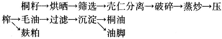采用木榨低温压榨桐仁,可制得低酸、色浅桐油,用于出口。