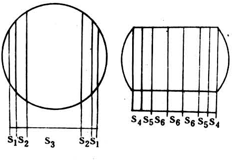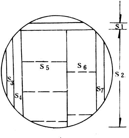 原木中部锯适当厚度的毛方,两侧锯割毛边板;中间毛方再继续锯板材(图3)。可用数字式表示为:S1—S2—S3—S2—S1;S4—S5—S6—S6—S6—S5—S4。四面下锯可以是对称的,也可以是不对称的。若需表示宽度和长度时,方法同前。