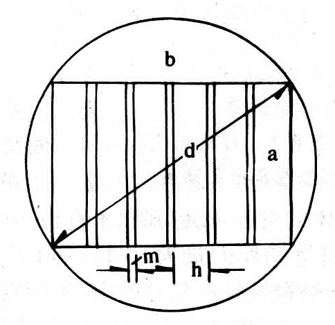 式中 d为原木直径;a为板材宽度;h为板材厚度;b为板材下料总厚度;m为锯口宽度(大带锯3.0毫米,小带锯2.1毫米)。计算板材块数时,要考虑第一块和最后一块板材带有适量的钝棱。
