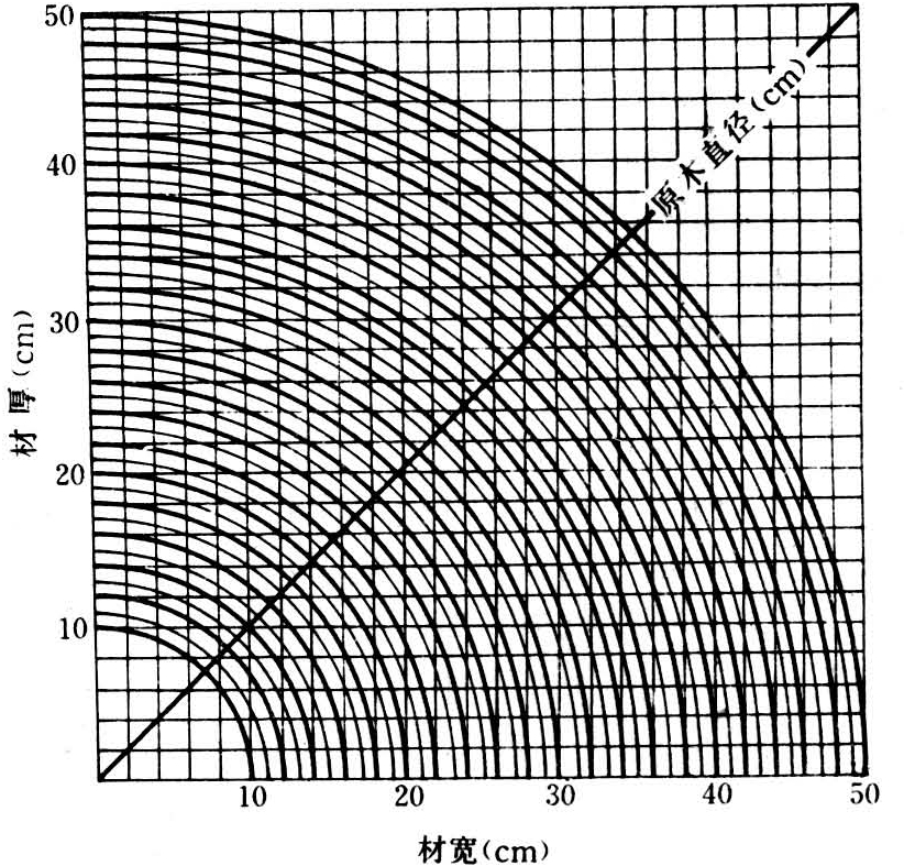 也称象限图(图11)。是按原木断面形状的1/4绘制成的。横坐标表示材宽,纵坐标表示材厚。其用途为:①已知方材、板材断面尺寸和它在下锯图上的位置,可以求出需用原木的直径;②已知原木直径,可以求出可锯制方材、板材宽和厚的最大尺寸;③可以查知上述方材、板材有无钝棱及钝棱尺寸大小;④按原木每隔1米长度其直径差为1厘米作假定的针叶树正常削度值,可以求出削度区域所能制取小于材长部分的板材尺寸和出材块数。