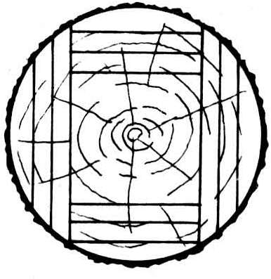 锯口沿着或接近沿着原木年轮切线方向的下锯法。采用这种下锯法锯割的锯材,从端面看,年轮走向与材面平行或接近平行,二者夹角小于30°(要求不严时,夹角也可放大到45°)称为弦切材。按对弦切材质量要求严格程度、需要量大小,或者原材料充足与否,可采用单一锯割弦切材的完全弦切材下锯法(图1),或和其他材料互相搭配锯割的带制弦切材下锯法(图2)。前者由于主产出材率低、工效不高,所以实际生产中采用不多;后者应用较广,因为在锯割一般锯材时均能带制一部分高质量的弦切材。