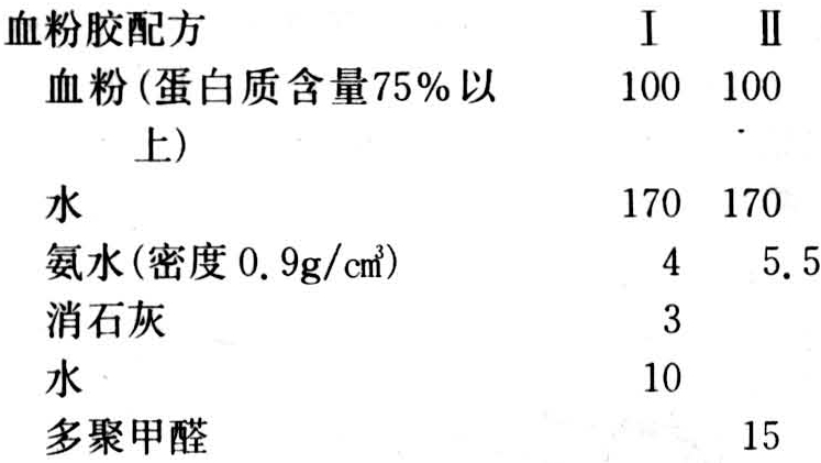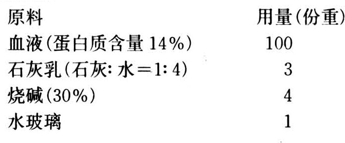 生产上使用的血胶和血粉胶配方列举如下: