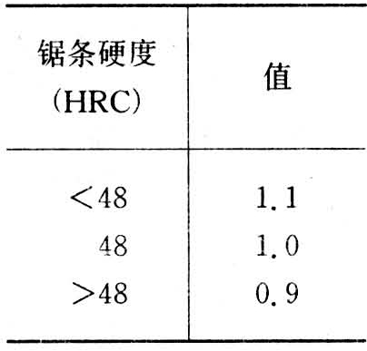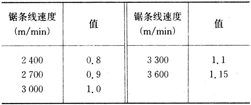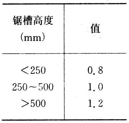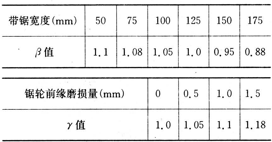 式中 C为矢高(毫米);K值为0.0009~0.0018;L为1/2卡尺长(毫米);β为带锯条宽度系数(表2β值);γ为锯轮磨损程度系数(表2γ值)。背缘侧伸长就是相对应的齿缘侧缩短。