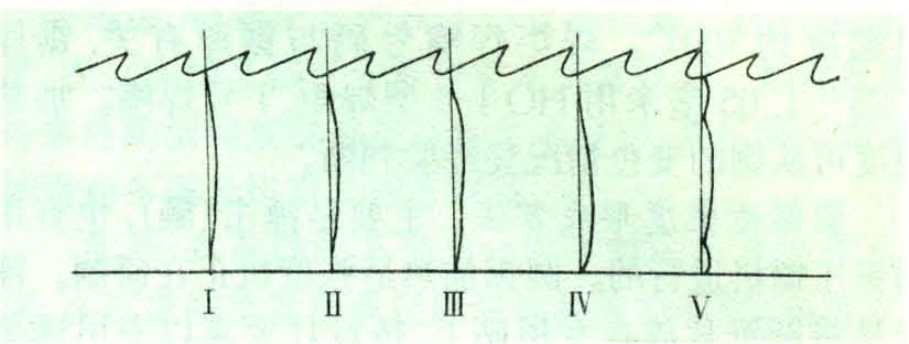 等量的适张度值,因处理方法不同,用适张度规检查可见不同类型,其技术特性也各异。常见带锯适张度类型如图1。各类型技术特性是:Ⅰ型是无口适张度,可用于锯割软材、小材,不适于高速生产。采用较少。Ⅱ型是基本型适张度,留有前、后口,应力较大,不易跑弯,锯条不易裂口,适张度耐久,便于修整。中国使用较普遍。Ⅲ型是前移型适张度,前大后小,可锯硬材、冻材,不避节子,进料速度可提高,但修整不及时齿根易裂口。Ⅳ型是后移型适张度,前小后大,避节子,因割硬材或进料量大时易跑弯,修整不及时锯背易裂口,已很少采用。Ⅴ型是“三软两硬”适张度,齿根和背缘各压一滚封口,形成三处软两处硬(两条应力线)。不跑锯、不裂口,适于高速生产,应用较普遍,但必须经常修整,保持常态。圆锯的适张度类型与带锯相似,特性亦同。