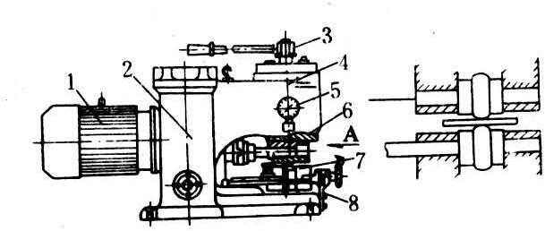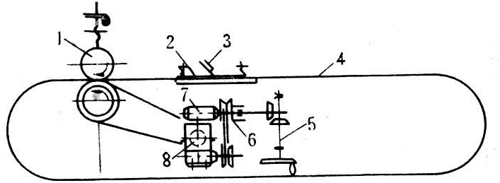 传统靠碾压,在压锯机上进行。图2是普通压锯机。将锯放在两个压辊之间,扳动施压手柄,在压力表上直接显示压力读数。滚痕分布有压对滚与压花滚之别,压新锯要在两面进行。加热适张度是利用金属材料热胀冷缩的物理特性在加热适张度机(图3)或利用压锯机装上加热装置进行。将带锯夹在加热机上,先用每分钟5米左右速度检查送锯是否正常,然后调到每分钟0.8~1米的速度,将焊炬调到与锯的前进方向成30°~40°角,喷射口距锯面10毫米左右,加热带宽5~8毫米,距齿底6~10毫米。加热形成的适张度一般属前移(Ⅲ)型,也可辅助以碾压法调整为其他型。锯背挠度不足可在锯宽中心线以下用碾压辊调整。加热时上限温度为450℃,下限温度约300℃。焊炬焊嘴号码与锯厚有关,锯厚1.25~1.05毫米用HO1-6型焊炬、1号焊嘴。加热温度可从锯的变色情况凭经验判断。