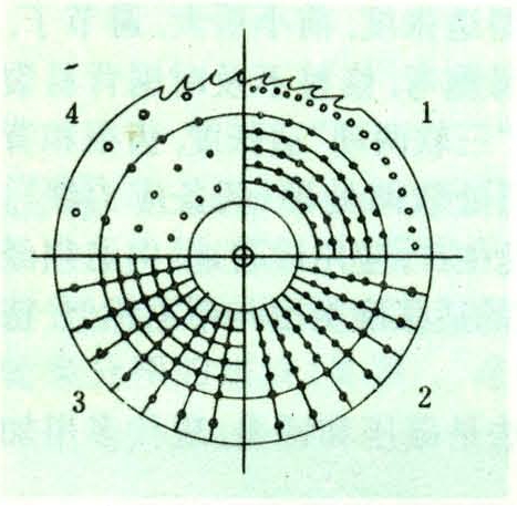 主要是锤击(砸),也有用圆锯压锯机进行的。圆锯加热适张度机正在研制。锤击是将圆锯片放在专用砧上,按设计要求以专用锤敲击,在锯的两面有规则地进行,大体上有4种,如图4。图中的圆点即锤击点,锤击力不宜过重而且要均匀,从两面敲对锤,也可敲花锤。①圆圈式:严格按一定顺序,从锯的一面小圈开始,然后锤另一面相对应的锤痕。两面小圈锤完时,将锯立起用手指插在锯孔内前后拉动,如无凹凸不均再锤另一圈,直至适张度到位。②辐射式:沿半径方向从圆心向齿根方向,各放射线逐条锤击,于半径中间处力量加重,向圆心和齿根方向力量渐减。③交点式:为最基本的方法。从法兰盘外圆留30毫米,齿根起留50毫米,然后划若干同心圆圈与8~16条等分放射线,敲交点。④自由式:又称连三锤法。凭经验进行,不易掌握,半径中间锤力加重。圆锯适张度也可形成基本型、前移型、后移型、三软两硬型4种,可任选。
