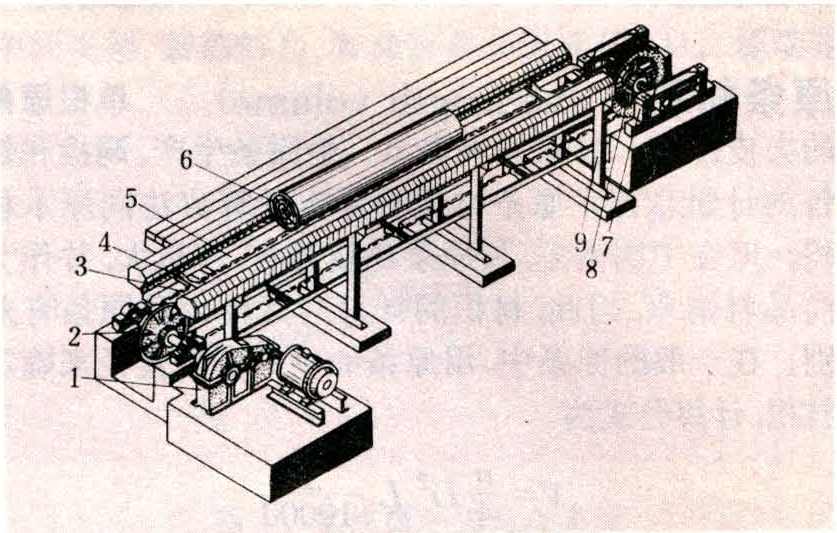 原木纵向输送机(见图)与其他工业部门所用输送机相比,其特点在于承载梁既起承托原木作用,又起支承牵引构件作用。承载梁有滚动式和滑动式两种。前者自重大,运行阻力小;后者自重小,运行阻力大。根据使用条件不同,承载梁上可用承载板、承载柱或承载钩来承托原木。承载梁的间距小于输送最短原木的长度,一般取1.5米左右。当驱动站发出的扭矩传给驱动轮时,牵引构件便曳承载梁沿导轨周而复始地运转。如果在喂料点将原木装到承载梁上,承载梁即将原木连续不断地运到另一地点卸下。