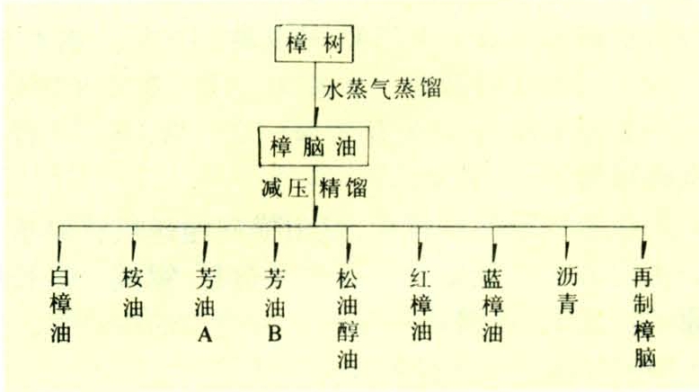 樟脑油加工流程见图。用水蒸气蒸馏方法取得樟脑油(见天然樟脑)。通过检验可以迅速区分出本樟油、油樟油、芳樟油。芳樟油具特殊清香;本樟油的б重和旋光度