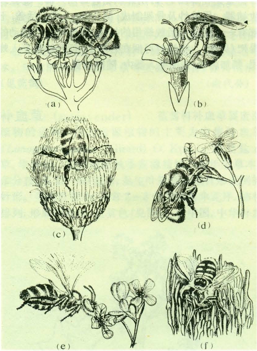 蜜蜂根据花的大小和形状,在采集时有不同的姿态(图1),可归纳为6种形式:(a)开始采集的姿式,以6只足平稳地站在花上;(b)蜜蜂一对前足和一对中足伸入花冠内,一对后足抵在花冠外,把花冠夹在其胸部和腹部之间,或夹在腹部和后足基节之间;(c)蜜蜂的6只足伸开跨立于花上或一丛小花上,头伸入花内采集;(d)一对前足抱着花,并以振翅帮助支持身体。蜜蜂吊在花上,伸出喙采集花蜜;以一对后足扫集身上的花粉;(e)蜜蜂飞悬在花 采集花蜜;(f)蜜蜂在花上或花内爬行,用其腹部扫集花粉。